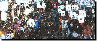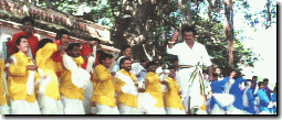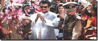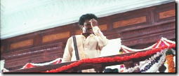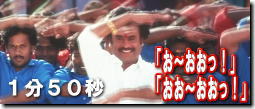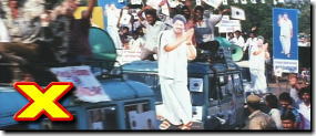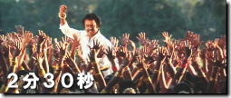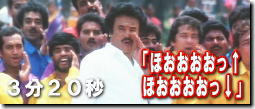 紙吹雪は、↑でご紹介した「あだんだ ぎたんだ♪」ミュージカルシーンの他に 映画開始から約2時間13分後の 「しんがむ おんどぅる♪(アルナーチャラムとパーン売りが選挙活動する場面のミュージカルシーン)」 で主に使用します。 ただし、継続時間は非常に短いので、タイミングを逸しないことが重要です。 以下にその場面をご紹介いたしますので、ご参考にしてください。 ![]() ▲「しんがむ おんどぅる♪(獅子が今旅立つ)」 のミュージカルシーンは、この激シブラジニ様の 映像でスタートします。