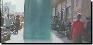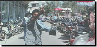 通常、成人男性が全速力で走るスピードは 分速300メートル(時速18キロメートル)程度ですが、 この泥棒の場合、・人通りの多いところを走っている・途中何度か後を振り返っている という2点を考慮し、分速250メートル程度と推測します。 したがって、泥棒がバッグを奪ってからソーダ瓶が命中するまでに走った総距離は・・ 250(メートル)×48(秒)÷60=200メートル ということになります。 一方、アルナーチャラム(ラジニ様)がソーダ瓶を投げてから泥棒に命中するまでの時間は「5秒」ですから、 ソーダ瓶のスピードは、時速に換算すると・・ 200(メートル)÷5(秒)×60×60=144000メートル つまり、時速144キロメートルという、プロ野球選手並のスピードで ソーダ瓶を投げていることになります。 さらに、この時の様子を詳しく検証してみると、このソーダ瓶は「回転運動」も 加わっていることがわかります。 時速144キロメートルという高速なスピードと、大幅な「回転運動」を 不安定な「ソーダ瓶」で実現してしまうとは、さすがはラジニ様であります!