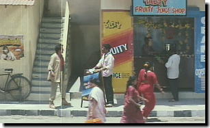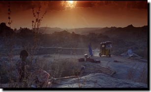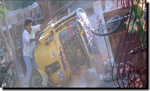 ![]() ▲ヒロインの運転するリクシャーが転倒! 豪快に横倒しになるリクシャー。 |