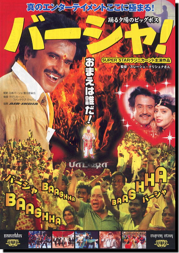 ●「バーシャ!踊る夕陽のビッグボス」とは? 南インド・マサラムービーの”スーパースター” ラジニカーント主演の「最高傑作」。 現地では、日本で大ヒットした「ムトゥ・踊るマハラジャ」と ほぼ同時期に公開。「ムトゥ」に負けない人気を博しました。 日本では2000年までに、オールナイト上映など イベントとして単発公開されたことはありましたが、 通常(昼間)上映は行われていませんでした。 したがってファンの間からは 「是非ラジニの最高傑作、バーシャ!を公開してほしい」 という要望が殺到、バーシャ!公開を目指して 「日本バーシャ!普及委員会」という団体まで発足。 そんなファンの熱い願いがようやくかない、 2001年6月、大阪での上映が決定しました! この上映では、日本初の「マサラシステム」導入が大成功、 「新たなラジニ旋風」が巻き起こりました! その勢いに乗って、同年8月11日からは東京・銀座にて、 そして9月には神戸・京都での上映が相次いで決定! 各地の上映とも超満員を記録し、 「ムトゥ」の大ヒットに続く、新たなる 「バーシャ!マサラシステム伝説」を生み出しました。 ●作品データ 監督:スレーシュ・クリシュナ プロデューサー:R.M.ヴェーラパン 音楽:デーヴァ 配給:日本バーシャ!普及委員会 |