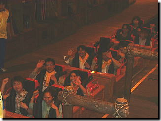 スピーカーから流れたことを、我々は聞き逃さなかった。そのアナウンスとは・・ 「安全バーは、しっかりと肩の位置まで降ろしてください。 貴重品はポケットから落ちないよう、充分ご注意ください。 ・・・・・・ タオルはしっかりと首に巻いてください。」 ジェットコースターでこんなアナウンス、今だかつて聞いたことナシ!(爆) また新たなる伝説が、夜のフェスティバルゲートに生まれたのでありました。 |