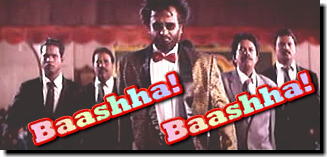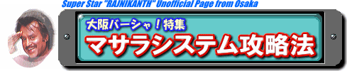まず最初は、超定番ともいえる ラジニ様「スーパースターロゴ」場面。 これは、「ヴィーラ」以降のラジニ様映画の冒頭、 必ず付けられているCGアニメーションで、 まさに 「これから始まるのは スーパースター・ラジニ様の映画です!!」 ということを、これでもかと主張しています。 現地では、このロゴが現れると 指笛や大歓声が巻き起こり、 バックミュージックで鳴り響く 「ヘイッヘイッ!!」という掛け声にあわせ 叫び狂う人も現れます。 そんな「ラジニ様映画熱狂」のシンボル 「スーパースターロゴ場面」では、 みなさんでご一緒に 「ヘイッヘイッ!!」と元気よく叫び まずはマサラシステムの ウォーミングアップをすることにいたしましょう。 なお、この「ヘイッヘイッ!!」コール練習用に 以下にビデオファイルをご用意いたしました。 このビデオで、皆様もどうぞ思う存分 練習に励んでください。 ●「ヘイッヘイッ!!」コール練習用ビデオ (リアルプレーヤーが必要です/473KB) また「スーパースターロゴ」には 別タイプもありますが、「バーシャ!」では 使用されません。 が、ご参考にいちおうそちらも ビデオファイルをご用意しておきました。 ●別バージョン練習用ビデオ (リアルプレーヤーが必要です/478KB) さあ、まずはこの「スーパースターロゴ」を バッチリとマスターいたしましょう〜! |