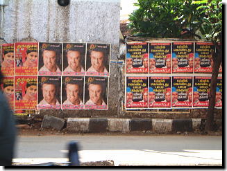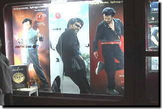 プレビューショーを観終わった翌日、オートリクシャーに乗って街並みを探索。 するとやっぱりありますありますバーバー看板&ポスター!! 全長30メートル以上はあると思われる大きな看板から、 露天や家の壁にペタペタと貼られたミニポスターまで、種類は様々。 一番数が多くて「公式」と思われるものは、↑の写真でご紹介した 白地に「黒い服を着たラジニ様」と「バーバーのロゴ」が描かれたものですが、 中には手書きでパワフルに描かれたラジニ様や、手のポーズだけ飛び出すように作られた 立体看板まであって、看板を見るだけでも充分楽しめました。 この日私たちは、バーバーのロゴとタミル語で「バーバー上映おめでとうございます」と書いた 自作Tシャツを着て街の散策をしていたのですが、 それを見るや否や、「バーバーの手のポーズ」を振りかざして近ずいてくるタミル人多数!! まさに街全体が「バーバーフィーバー」!!、そんな感じになっておりました。 |