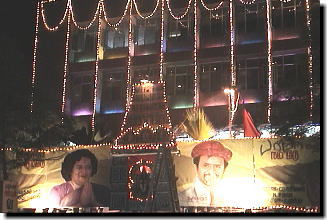 ![]() ▲映画館(アルベルトシアター)前の バーバー公開記念大看板&神様 左のイラストはラジニ様の奥様の「ラタ様」。 |