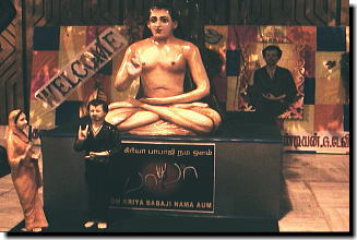 そんな中、覚えたてのタミル語で 「私はラジニ様のバーバーを観るために、日本からチェンナイに来ました。 (なーん らじにいん ばーばーばい ぱーるぱだるっかーが じゃぱんいる いるんどぅ ちぇんないっく わんでーん)」 と言ってみると、たちまち抱きつかれたりキスされたり(笑)大変な状態に・・。 試しに「バーバーの手のポーズ」を作って振りかざしてみると、 何とまわりの300人以上はいるタミル人の方々も一斉に「バーバーポーズ」を作って大歓声!! この時点ですでにビデオカメラは回せない状況となってしまいました(笑) その後、この映画館の館長さんが私たちとお話したい、ということで劇場内へ。 ここでも、ドサクサ紛れに私たちの後にピタッと引っ付いて入場する人約20名(笑) 館内は広くて、「バーバー」の綺麗な写真や、ヒマラヤのバーバージーのオブジェ などが早速展示されていました。 館長さんには、日本でのラジニ映画人気のことを話したり、アルバムを見てもらったりして 映画開始まで有意義な時間を過ごすことができました。 おまけに「外はこれからもっと混乱するから、今やってる映画をタダで見せてあげる」と 言ってくださり、ビジャイ主演の「ユース」を少し見ることができて、これまたラッキーでした! |