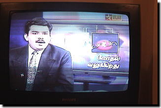 ![]() ▲バーバー公開の様子を伝える ビジャイTVのキャスター。 どの放送局も「バーバー」一色。 |