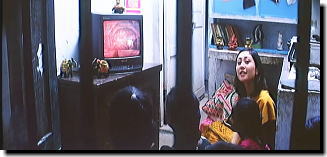 酒盛りに続いては、今度は「トランプ博打」。 そのゲーム中、1人の仲間が突然立ち上がり、ガネーシャ(ヒンドゥー教の神様)の仏像へお祈りに。 帰ってきたこの男に、バーバーの一番弟子アンナーマライは 「何しに行ってたんだ?お前神様なんて信じてるのか?ナンセンスだ。」などと罵倒します。 「俺は神様もオンナも嘲笑ってやるぜ。」そう答えるアンナーマライ。 しかしこの勝負は結局、ガネーシャにお祈りに行った仲間が勝利。 そこに、バーバーの妹ラクシュミがやって来ます。 「ねえバーバーお願い!自転車の乗り方を教えて〜。」 「今はダメだ。」そっけなく答えるバーバー。 それを見たアンナーマライ。さっきは「オンナも嘲笑う」と言っていたのに態度180度転換(笑) 「ボクが教えてあげるよ〜、アイラブユ〜・ラクシュミ〜。」 「私はバーバーにしか教えてもらわないのよ!」 早速フラれるアンナーマライ。 トコロは変わって、バーバーの近所の古びた家。 その家の中では、日本人の「ケイコ」が1人でテレビを見ています。 窓越しにそのテレビを見るバーバーと仲間達。 放送中のテレビは「インドの古い映画から、神秘的なものをご紹介しましょう」という内容。 興味深そうにテレビを見るケイコとは対照的に、 バーバーたちは放送中の神様映画の内容をバカにします。 「滑稽だ。」「笑っちまうぜ。」「演技が合ってない。」 真剣に見るケイコに対してバーバーは 「ケイコの国でも、こんな話は信じてるのか?」と尋ねます。 「もちろん信じてます!」、何のためらいもなくキッパリと答えるケイコ。 続いてテレビには、1人の男がマントラを唱えると願いがかなってしまう、という物語が放送されています。 「マントラを唱えたら願いがかなうだって?バカじゃないのか。」 バーバーがそう思った瞬間、どこからともなく声が聞こえてきます。 「お前が知っているのは滴にすぎない。大海を知らないのだ!!」 ボロ布をまとい、やせた犬を連れたその男は、家の屋根からバーバーたちにそう叫びます。 バーバーの仲間たちは、耳も傾けずそそくさと退散。 しかしバーバーは、なぜかその男の言うことを真剣に聞き入ってしまうのでした。