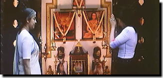 数日後・・。 「あの3姉妹が屋上でキワドイ服を着てエクササイズするみたいだぞ!」 バーバーの仲間3人は、またニヤニヤしながら隣の家の屋上を眺めています。 最初は母親が出てきてガックシ(笑)だったのですが、やがて3姉妹登場。 手を左右に振りながらエクササイズスタート。 思わずバーバーの仲間達も腕をフリフリ。 それを後から見ていたバーバー。 「アンナーマライ。そのポーズは何だ??」 とっさに「エ、エ、エクササイズさ。」と答えるアンナーマライ。 しかしバーバーが周りの様子を見渡して見ると、まわりにいる男達の視線は、み〜んな一点に集中。 その方向を見てみると、あの3姉妹がキワドイ服装でエクササイズ・・。 「そういうことだったのか。」とバーバー。指笛をピーーイッと鳴らし、エクササイズを中断させます。 しかし彼女たちも負けていません。指笛を鳴らし返して 「何よ何よ何よ!!」「何か悪いの?エクササイズしてるだけじゃない。」と応戦。 バーバーは「家の中でやりなさい。悪い男たちが見ているから。」とアドバイス。 しかし彼女達はそれに納得せず、バーバーの言うことを聞き入れようとしません。 思い余ったバーバーは、 「エクササイズなんて必要ない。俺はエクササイズは知らないがヨガの知識は少しある。 家事をしてみろ。例えば掃除だ!足や腕に充分なエクササイズになる。 これをヨガの世界では「クールマーサナ・ウスカタサナ」と言う。 洗濯をしてみろ!腕はひきしまり指も綺麗になる。ヨガの教えでは「アルダウダラサナ」だ!」 などと、次々ヨガの教えを披露して 「エクササイズするくらいなら、家事をきちんとしろ。 家事をしないでエクササイズなんて本末転倒だ!」と熱弁します。 バーバーの仲間たちは、バーバーの知識の多さとその雄弁ぶりにビックリ。 彼女たちも完全に圧倒されてしまいます。 これを見ていたチャムンデシュワリの両親。 母親は「彼の言っていたヨガの知識は本当なの?」と夫に尋ねます。 「もちろん本当さ!」