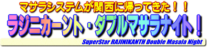 10月7日(土)深夜〜8日早朝 「京都みなみ会館」にて ついに開催決定!! 2001年、日本でのラジニ映画人気に火をつけた 南インド風映画鑑賞方法「マサラシステム」が 3年ぶりに関西に帰ってきました!! しかも今回は、何と・・ 伝説のマサラシステム映画【バーシャ!】と 新作【チャンドラムキ】の新旧2作品を オールナイトで連続フルマサラシステム上映!! 1回の上映でさえ 「ばぁ〜い!」と逃げ出す劇場が多い中 「京都みなみ会館」さんの勇気とヤル気は ラジニ様のごとく、ハンパなモノではありません。 このページでは、そんな劇場さんを応援すべく このオールナイト上映会の全貌を 詳しくお伝えいたしてまいります!! |