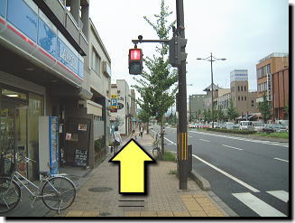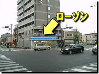 | ▲右方向に進むとすぐに交差点があります。 道路の反対側に「ローソン」が見えます。 まずその「ローソン」前に進んでください。 |