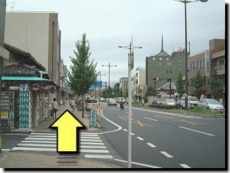 ▲「ローソン前」まで進んだら、 そのまま国道を直進です。 Pマークのコイン駐車場のほうへ進んでください。 |