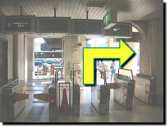 ▲改札口はこの1ヶ所のみ。 改札を出たらまず右方向に 進んでいってください。 |