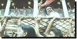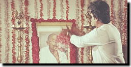 映画スタート直後、 ラジニ様がガンジーに花をたむけます。 この場面でも一緒に紙吹雪をまき 気分を高めましょう。 |