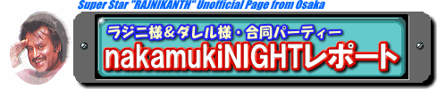 2001年6月30日、 大阪ミナミが熱く燃えた!! 「大阪パダヤッパアンコール」がスタートした この日、ミナミのインド料理レストラン 「ミティーラ」にて、nakamukiさん主催の 「ダレル様/ラジニ様 合同パーティー・ (通称”nakamukiNIGHT”)」が 開催されました! このイベントに「大リク協」メンバーも乱入! 場内は踊れ・踊れの大騒ぎに・・! このページではその日の模様を 写真も交えてレポートいたします〜♪ |