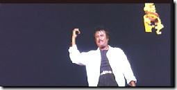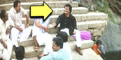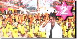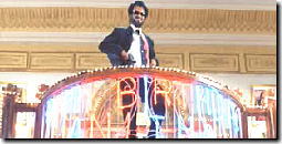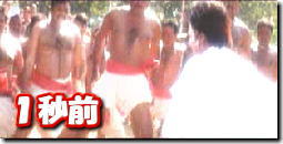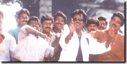 左手に怪しいオヤジが 座っている中を 上半身裸の 宙返り軍団が登場。 奥からラジニ様接近。 |