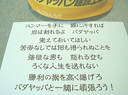 パダヤッパの中で一番印象に残る曲といえば エンドロールでも使われている 「勝利の旗を高く揚げろ!」。 その曲に最も良く似合うファッションが このヘルメ姿です。 御影石発掘工事はもちろん 小学校・信託銀行建設工事など 多彩な用途にご使用いただけます。 ●価格:800円(税込み/白紐は別売り) ●販売日:注文生産(在庫なし) ●注意事項:牛の奇襲や、バズーカ砲攻撃 に対しては、安全効果は得られません。 |