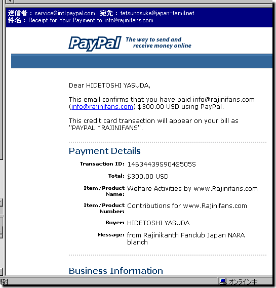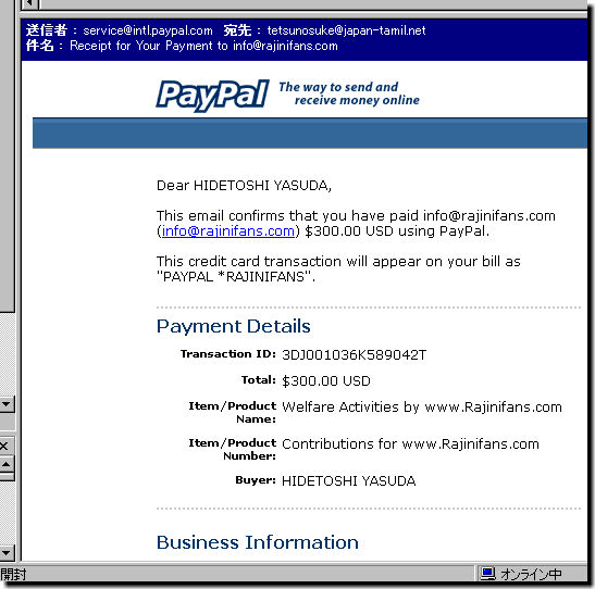 US$300.00(約¥32,000)をPayPalで現地ファンクラブへ送金