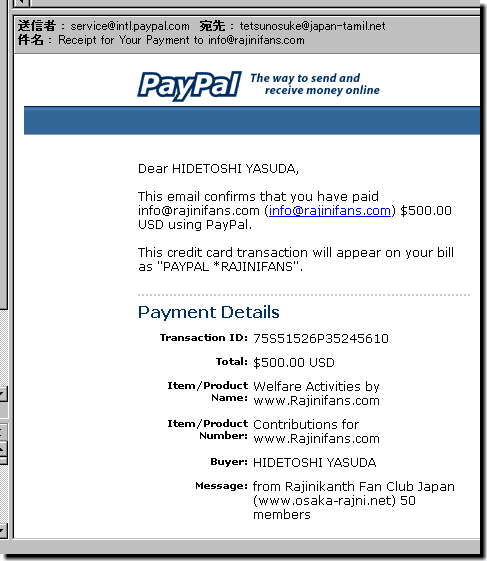 US$500.00(約¥51,000)をPayPalで現地ファンクラブへ送金