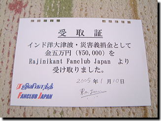 スリランカへの義捐金(現在大阪在住のスリランカ出身タミル人でラジニファンのジャヤさんを経由)と、